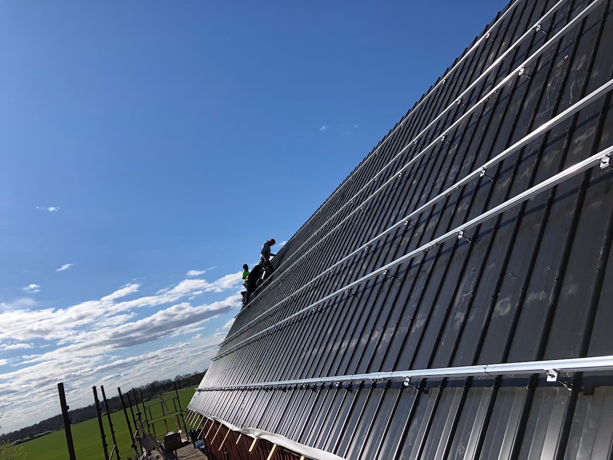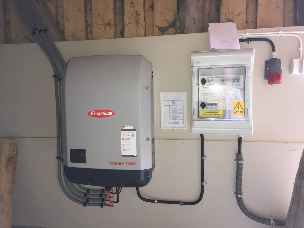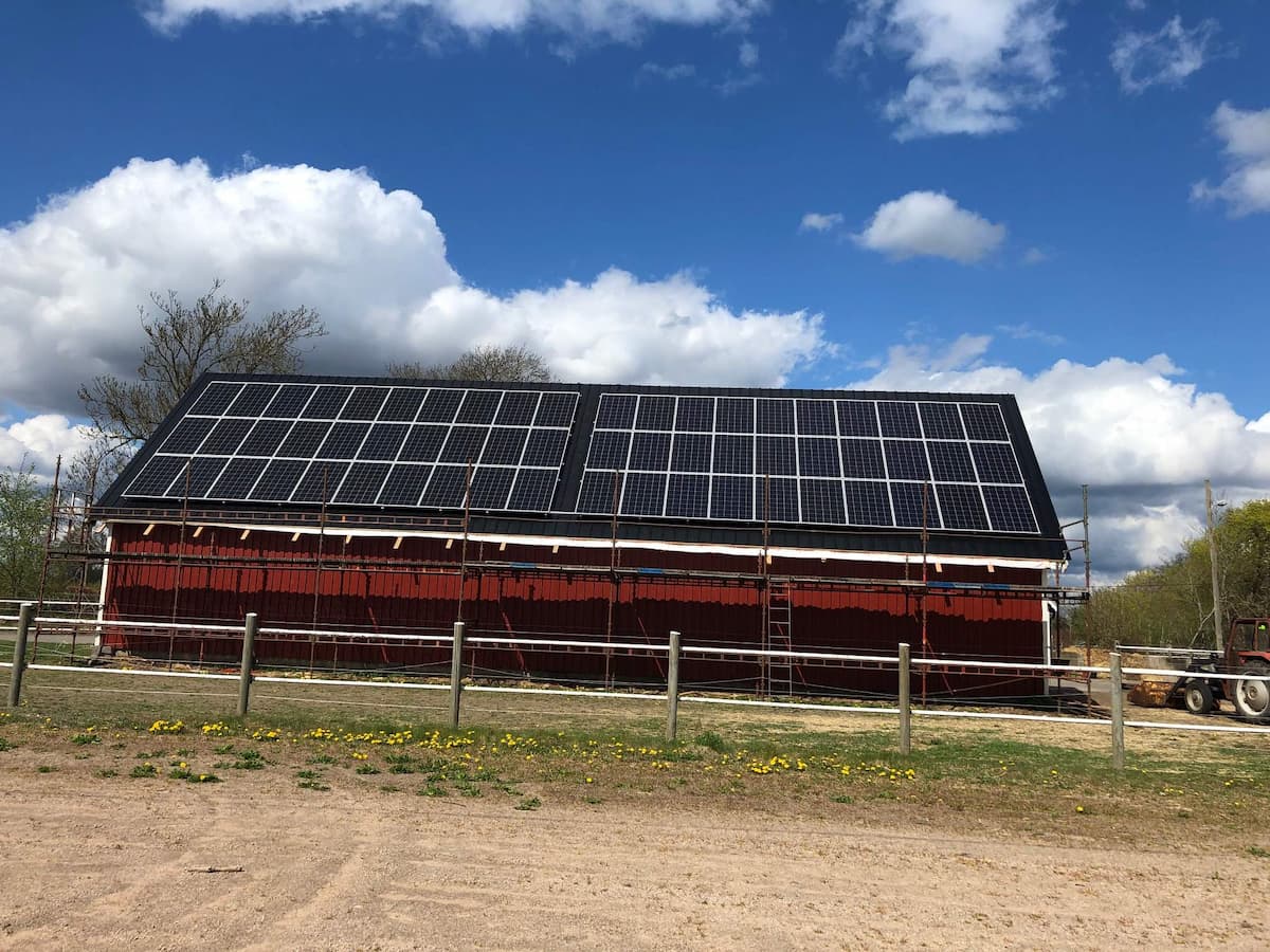 Garage med söderläge i Fjäkestad. Taklutningen med drygt 40 grader, 0 graders avvikelse från söder och det skuggfria läget ger så gott som optimala förutsättningar för hög produktion.