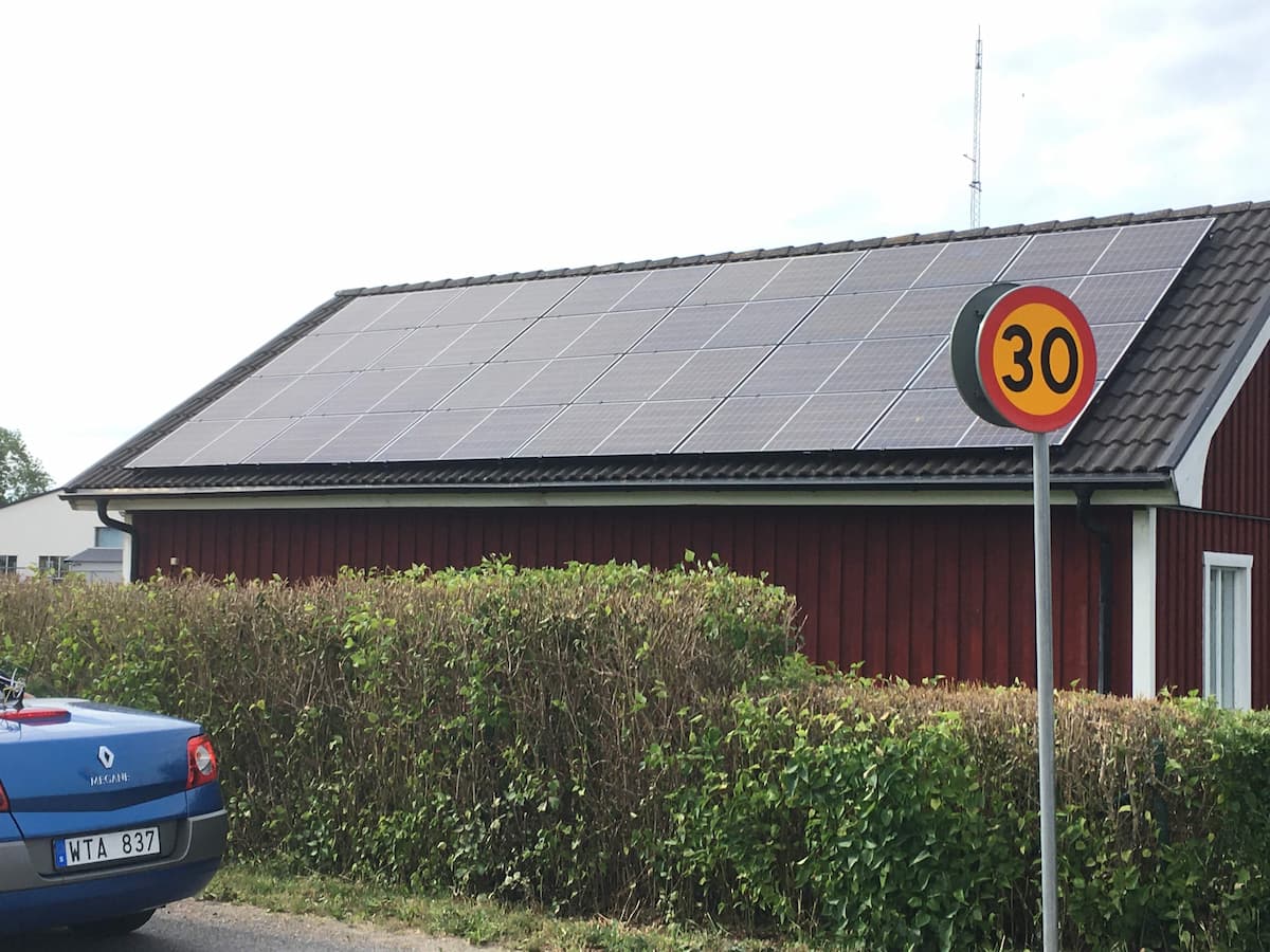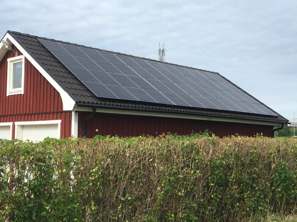 Garage i söderläge i Rinkaby. Taket har ca 28 graders lutning och panelerna är monterade med liggande placering. Växelriktaren sitter i samma byggnad.
