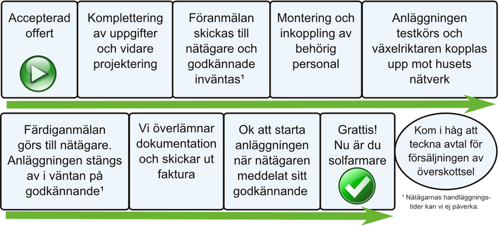 Vi tar hand om hela processen kring anläggningen. Montering och inkoppling sker av behörig personal och vår elektriker gör föranmälan till ditt elnätsbolag samt färdiganmälan när installationen är klar.