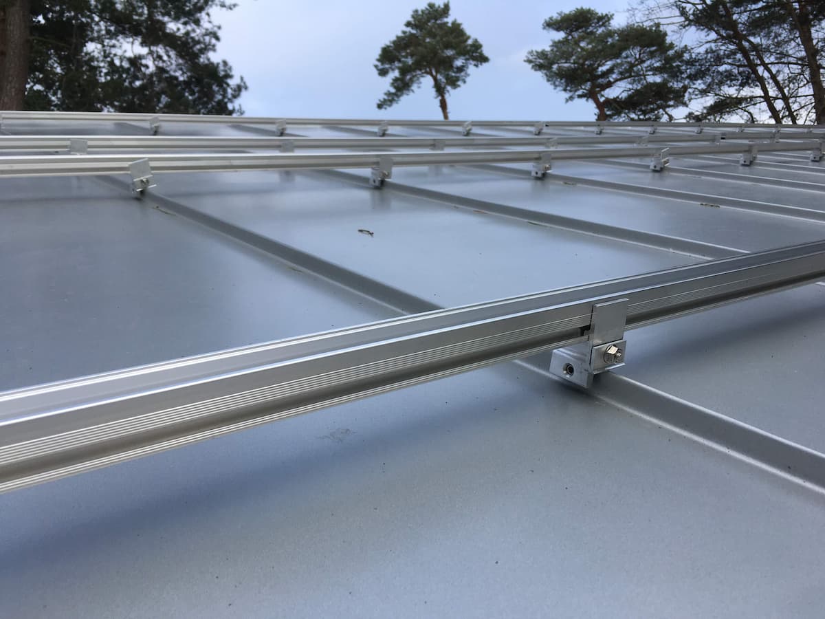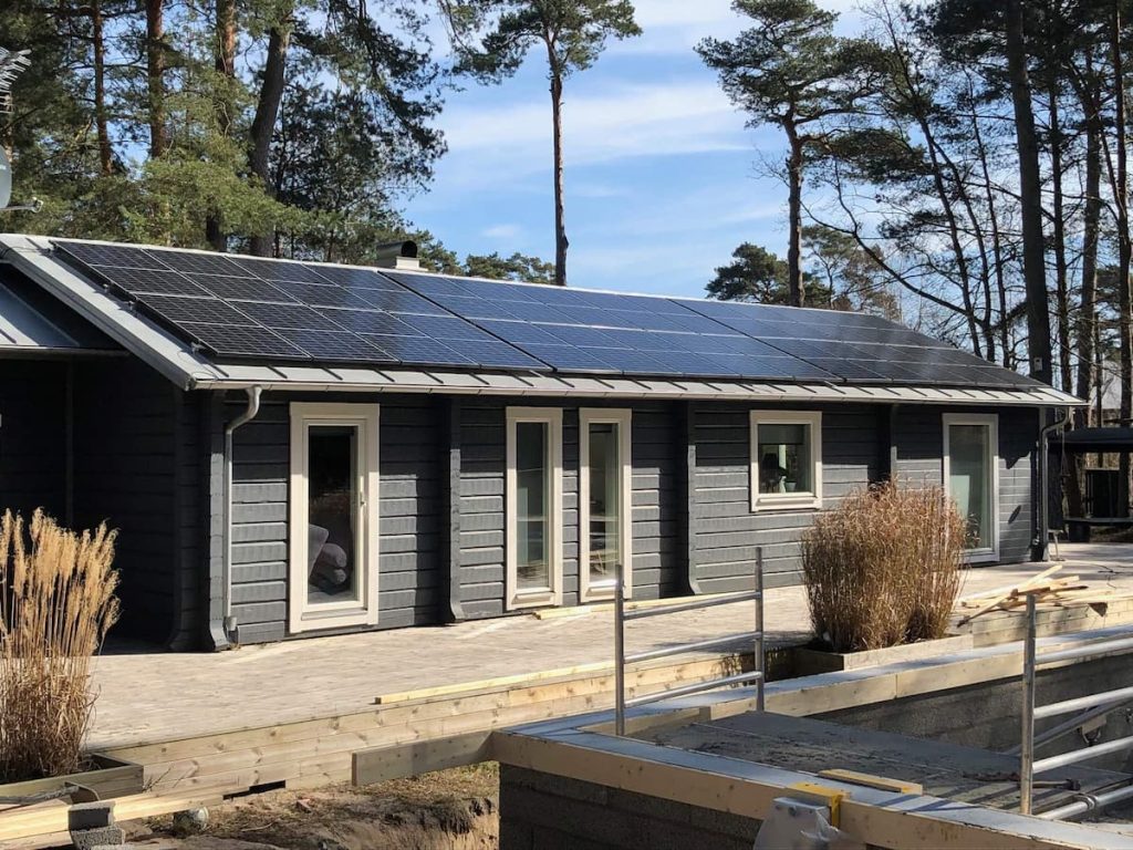Sommarstuga med sydvästligt tak på Äspet, Åhus. Taklutningen är omkring 15 grader på detta snygga falsade plåttak. Växelriktaren kommer sitta utomhus på skyddad norrvägg.