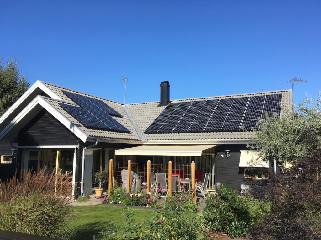 Villa med syd- och västläge i Åhus. Taket har ca 27 graders lutning och panelerna är monterade med liggande placering. Växelriktaren sitter i tvättstugan.