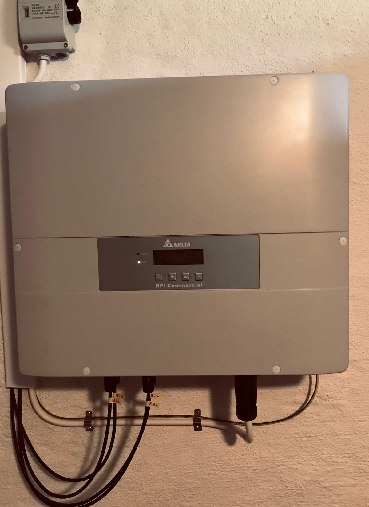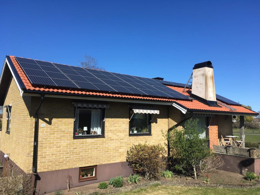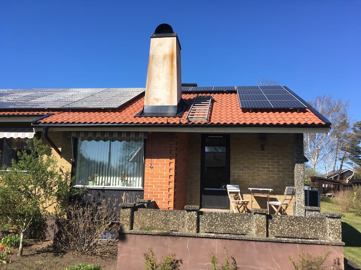 Villa med så gott som rakt söderläge i Viby. Taklutningen är omkring 25 grader. Eftersom skorstenen kommer kasta skuggor på panelerna bakom är berörda paneler utrustade med optimerare. Växelriktaren kommer sitta inomhus i källaren.